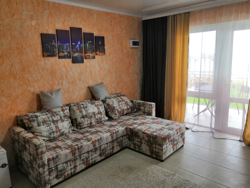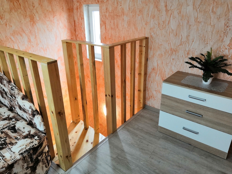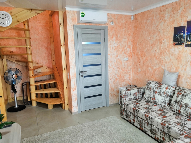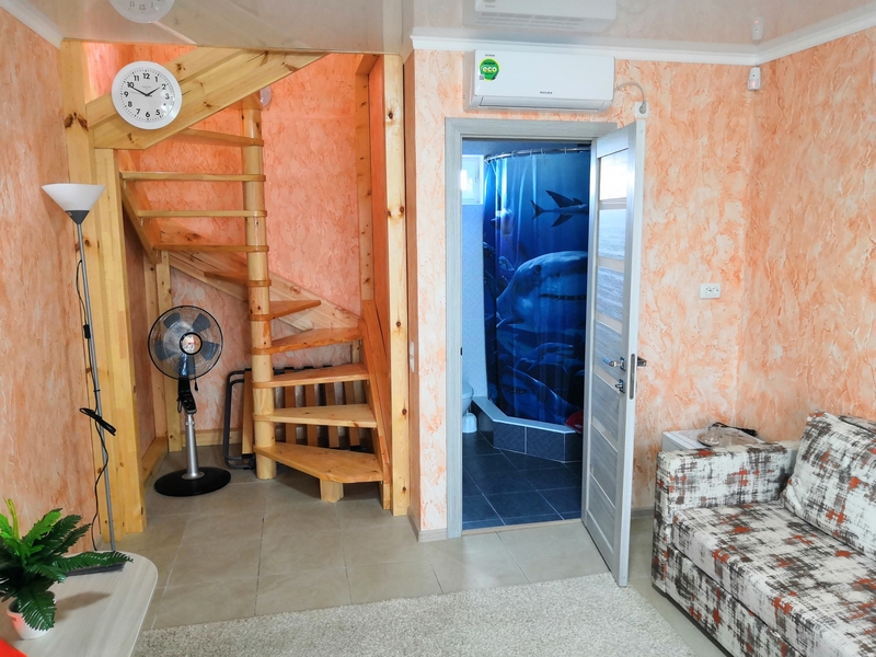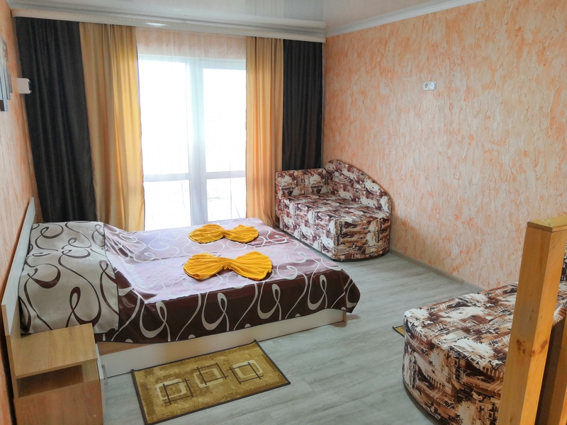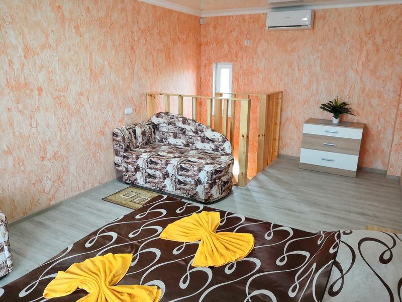 Семейный - двухэтажный номер "Люкс" расположен на первом и втором этажах гостевого дома с видом на море. Для комфортного проживания в номере 1 этаж – студия: раскладной диван, вешалка, журнальный стол, шкаф, телевизор, холодильник, кондиционер, с/у, сейф, сушилка для белья, вай фай; 2 этаж – спальная зона: одна двухспальная кровать, одна односпальная кровать, (либо мини диван), комод, кондиционер, вай фай, по желанию детская кроватка, отдельный выход на балкон.